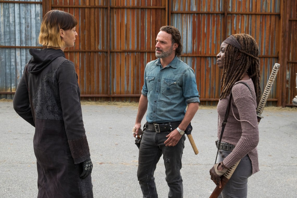 Andrew Lincoln as Rick Grimes, Danai Gurira as Michonne, Pollyanna McIntosh as Jadis – The Walking Dead _ Season 7, Episode 16 – Photo Credit: Gene Page/AMC